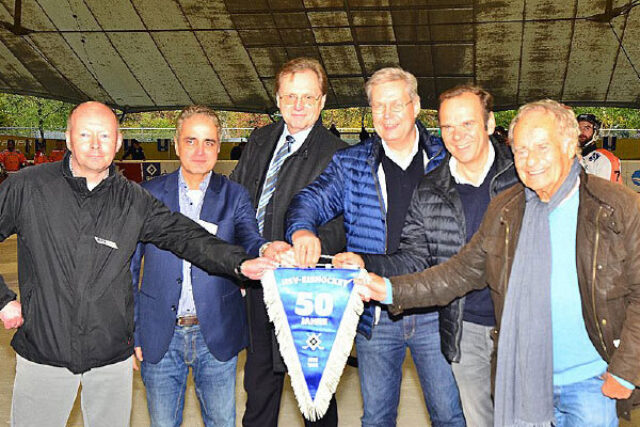 Von den ehemaligen Hamburg Freezers schauten Verteidigerikone Christoph Schubert als Coach des Legendenteams sowie der ehemalige Freezers-Geschäftsführer Boris Capla vorbei. Garniert wurde der Festtag mit Ehrungen, vielen netten Worten und Anekdoten, selbstverständlich auch vonseiten des gesamten Vereins. So war das Präsidium durch Thomas Schulz vertreten und der Seniorenrat mit Heiko Frank sowie der Amateurvorstand mit Alexander Eckball vor Ort. Auch der Vorstandsvorsitzende der HSV Fußball AG, Bernd Hoffmann, ließ es sich nicht nehmen, persönlich zu gratulieren. Gemeinsam überreichten sie der Abteilungsleitung einen Jubiläumswimpel. Eine rundum tolle Feier. Auf die nächsten fünfzig Jahre! |