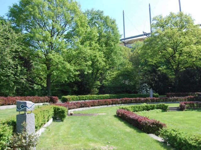 Ein paar Meter weiter, in einem großen Halbrund und über mehrere Ebenen verteilt, befinden sich die Grabstätten. Der Aufbau erinnert an eine Stadionkurve, alles soll einen authentischen Fußballbezug haben, schließlich sollen hauptsächlich Fußballfans den Friedhof für sich entdecken.