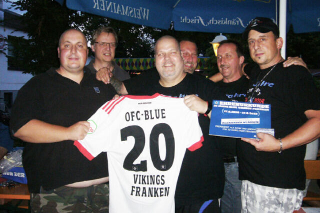 Mitte der Neunzigerjahre fanden sich im Großraum Bamberg zufällig einige junge Männer zusammen, die ihre Liebe zum HSV verband. 1998 wurde der Entschluss gefasst, einen Fanclub zu gründen, und am 17. August in die Tat umgesetzt. Seit diesem Tag gibt es den OFC Blue Vikings Franken. Als Treffpunkt kristallisierte sich das Sportlerheim des SV Memmelsdorf (Bamberger Straße 3, 96117 Memmelsdorf) heraus, das sich durch seine zentrale Lage als Basis bestens bewährt hat. Besonders in den letzten Jahren konnte der Fanclub deutlichen Zuwachs verbuchen. Das Einzugsgebiet breitete sich immer weiter aus. Je bescheidener die Leistungen und Ergebnisse der Mannschaft wurden, desto mehr HSVer suchten bei den Blue Vikings eine Fanheimat. Ob diese Entwicklung ein Sieg der Vernunft oder die Angst vor der (Fan-)Einsamkeit ist, ist schwer zu beantworten. Tatsache ist, dass zu den Veranstaltungen (Sommerfest, regelmäßige Fantreffen, Jahresabschlussfeier und so weiter) Teilnehmer aus allen Himmelsrichtungen kommen. Viele nehmen hundert oder mehr Kilometer Anreise auf sich, um ihre Liebe zum HSV unter Gleichgesinnten auszuleben. Das Wikingerreich erstreckt sich vom Coburger Land bis ins Altmühltal und von der Rhön bis ins Fichtelgebirge und die Oberpfalz. Für alle, die in Nordbayern nicht ortskundig sind: das Gebiet ist verdammt groß. Der jüngste Wikinger ist ein zehnjähriger Schüler, der älteste ein siebzigjähriger Rentner. Eine bunte Mischung quer durch alle Gesellschaftsschichten und unabhängig vom Geschlecht. Die Blue Vikings heute, das sind rund fünfzig aktive Fanclubmitglieder, davon 35 mit HSV-Mitgliedsauweis, und annähernd die gleiche Zahl von Sympathisanten, die von Zeit zu Zeit an den Aktivitäten teilnehmen. In unseren Reihen sind acht Dauerkartenbesitzer, und für fast jedes Auswärtsspiel erfolgt eine Ticketbestellung. Es gibt praktisch kein Pflichtspiel der Rothosen ohne fränkische Wikinger auf der Tribüne. Und das, obwohl zwischen Stammlokal und Volkspark rund 550 Kilometer liegen!