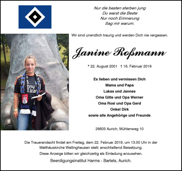 Wir wünschen Familie Roßmann, dass der Glaube und die Liebe zum HSV ihr weiter viel Kraft geben, um das tragische Unglück zu verarbeiten. Ein altes Sprichwort besagt, die Zeit heile alle Wunden. Sicher gilt: Zeit hilft und schließt viele Wunden. Die Erinnerung an Janine und die Liebe zum HSV wird bleiben. Und wie steht schon in der Todesanzeige? Nur die Besten sterben jung. Du warst die Beste. Ruhe in Frieden.