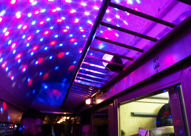 Samstag, 0.20 Uhr: Die Türen werden geöffnet und die Leute, die bereits am Gleis sind, können den Zug nun entern. Währenddessen läuft die Arbeit in dem Bar- und Tanzwagen auf Hochtouren: Nach Prüfung der Zapfanlage werden die ersten Fässer angeschlossen und die Bar wird mit allerlei Leckereien in fester und flüssiger Form bestückt. Die DJs bauen zeitgleich ihr Equipment auf und stellen damit sicher, dass allen Mitfahrenden hier heute gehörig eingeheizt werden kann.