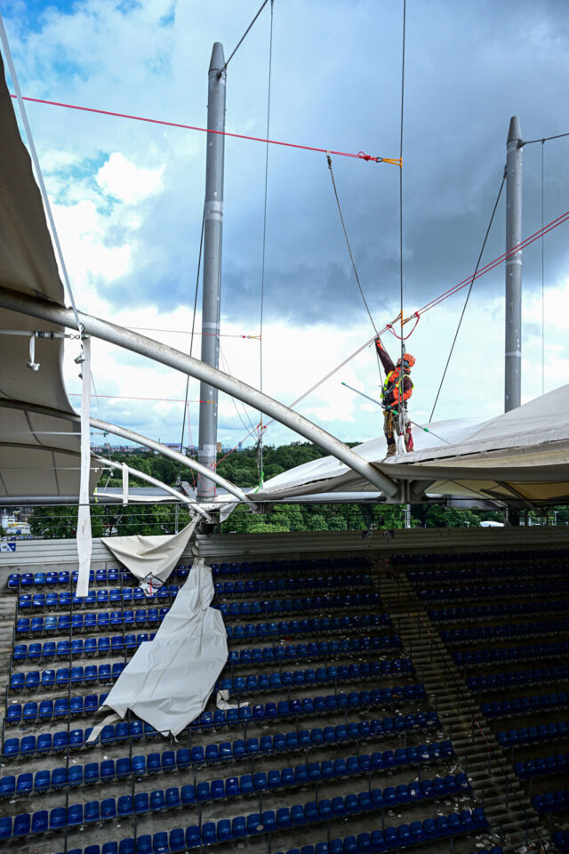 Von dem Turnier unabhängig ist das Dach. Es hätte theoretisch auch nach der Euro 2024 ausgetauscht werden können. Um das Dach erneuern zu können, wurden acht Pylonen im Osten des Stadions verstärkt. Kurz nach dem ersten Saisonheimspiel gegen Schalke 04 wurde die erste Dachmembran ausgetauscht. „Ungefähr 35.000 Quadratmeter Membran teilen sich auf vierzig Felder auf“, erklärt Lenz. Die Felder wurden nacheinander getauscht, kurz vor Weihnachten das letzte. In einem finalen Schritt wurden die restlichen Detailbereiche geschlossen und die Entwässerung des Dachs wieder angebunden. Die Dacharbeiten sind seit Februar abgeschlossen.