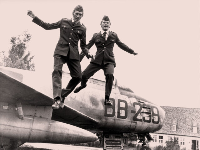 Auf dem Platz Spieler, daneben Soldat: Ein Schnappschuss von Manfred Kaltz (links) und Caspar Memering in Uniform.