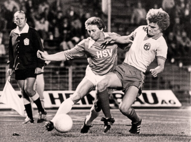 Arno Steffenhagen (links) umkurvt seinen Gegenspieler mit den ikonografischen HSV-Lettern auf der Brust.