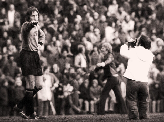 Paparazzi-Alarm: Torwart Rudi Kargus verweist einen Fan des Spielfeldes, der ihn im Strafraum während des Spiels fotografiert.